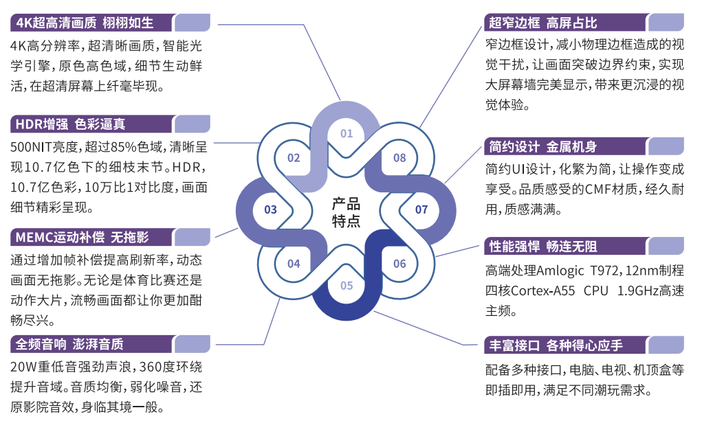 4K高分辨率,超清晰画质,智能光学引擎,原色高色域,细节生动鲜活,在超清屏幕上纤毫毕现。
