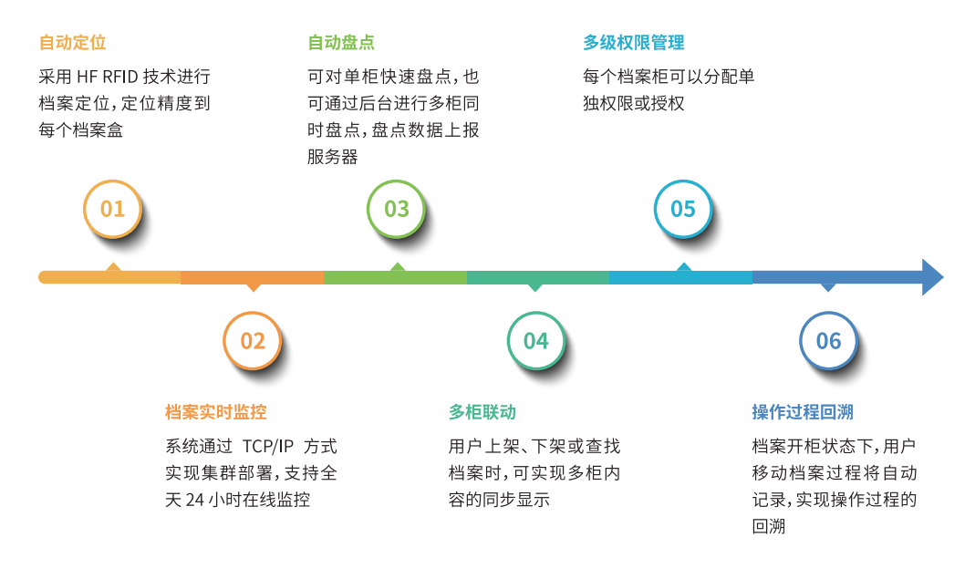档案柜基于信创环境开发,安全可靠,采用RFID技术可以实现柜内档案位置的精准定位、档案远程自动盘点。整柜提供合规的八防措施,可以实现远程实时监控,自动应用报警。产品无特殊承重要求,柜体摆放灵活,安装方便,具有超强扩容保管空间,主副柜配置可以自由扩展。