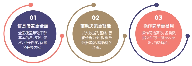 本产品通过建立统一信息采集标准,整合优秀年轻干部相关材料,并纳入干部信息管理工作,实现信息的采集、汇总、管理和分析,并根据系统内列出的信息,添加年轻干部候选人,输出优秀年轻干部成长档案。结合多维数据开展优秀年轻干部综合分析,为领导干部选人用人提供科学依据。