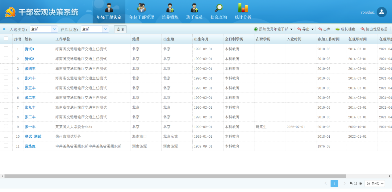 全面覆盖年轻干部基本信息、奖惩、考核、成长档案、优青名册等内容。