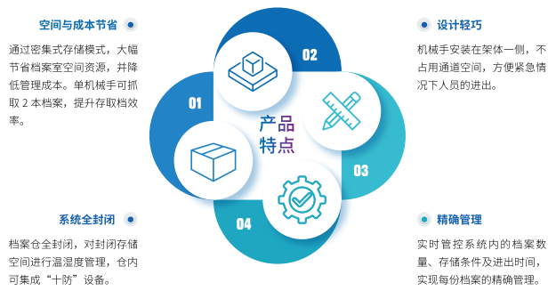 空间与成本节省:通过密集式存储模式,大幅节省档案室空间资源,并降低管理成本。单机械手可抓取2本档案,提升存取档效雯