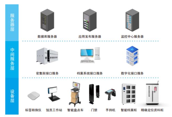 设备层为各类RFID设备,设备层通过TCP/IP接口接入档案馆内网,与服务器层和中间服务层通讯。设备层包括:标签转换仪、馆员工作站、安全门禁、智能盘点车、手持机等硬件设备,通过RFID电子标签对实物档案进行唯一标识,实现档案的快速、批量盘点,精准查询与定位,安全防盗、动态路径跟踪等功能,提高档案管理的电子化、智能化水平。
