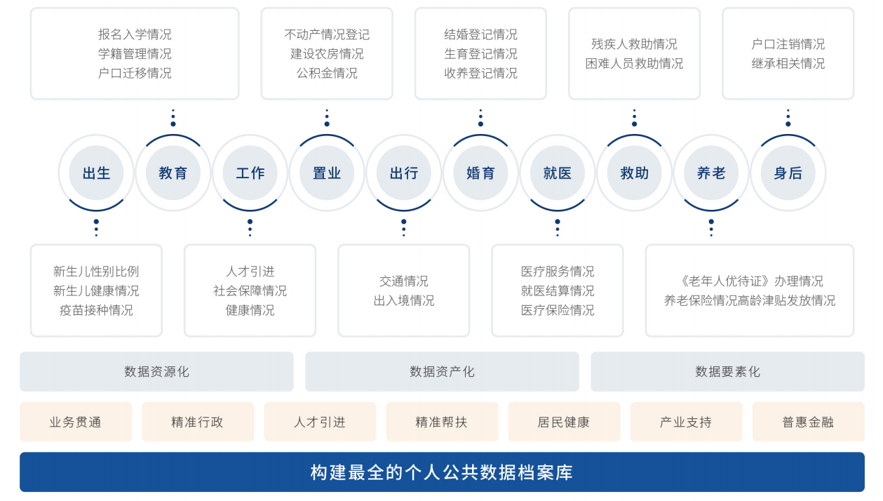 通过对数据治理理论、档案学理论及规范标准的应用,推进公共数据精准化治理和应用。将一体化智能化公共数据平台数据和档案馆藏数据进行有效融合、治理、溯源,通过多源汇聚、多重校验、多表合一等技术,建立1个可信赖的“个人全生命周期档案”数据资源中心,并构建“1+10+N”的个人全生命周期档案综合智治应用框架,即按照出生、教育、工作、置业、出行、婚育、就医、救助、养老、身后等10个人生阶段,打造N个基于个人全生命周期档案数据典型应用场景。