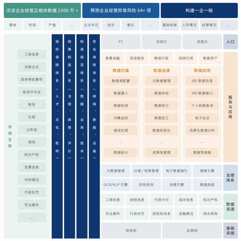 围绕企业发展全生命周期从招商到落地经营、发展,不断提炼创新数字化场景应用,打造营商环境新高地,助力企业高质量发展。秉持以数据为核心,为数据治理思路开展企业全生命周期建设,基于业务使用场景,搭建企业全生命周期应用,围绕企服数据标准,沉淀企服数据资产,依托数智应用场景,构建智能分析模型。