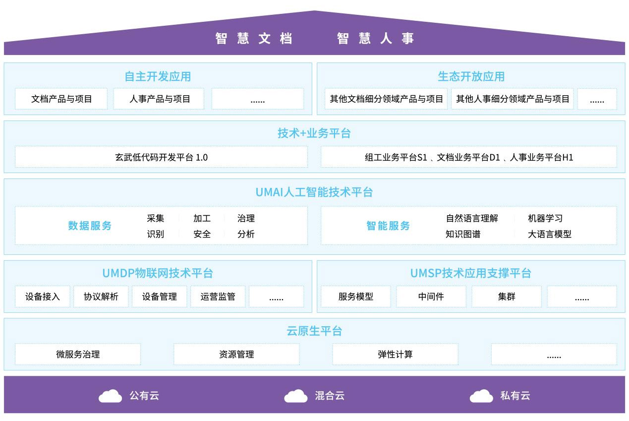 航星永志盘古HOUM 行业PaaS平台基于云原生平台、微服务架构,融合低代码、智能物联、大数据、人工智能等技术,包含了UMAI人工智能平台、UMDP物联网平台、UMSP应用支撑平台的三大核心技术平台以及玄武低代码技术平台,针对组工、文档、人事业务提供低代码开发、数据服务、智能服务等应用创新能力,同时通过图形化快速开发与个性化配置能力、端到端的业务流程驱动能力,打造智能的数字化交互体验,加速构建智慧文档+智慧人事数智化转型升级。