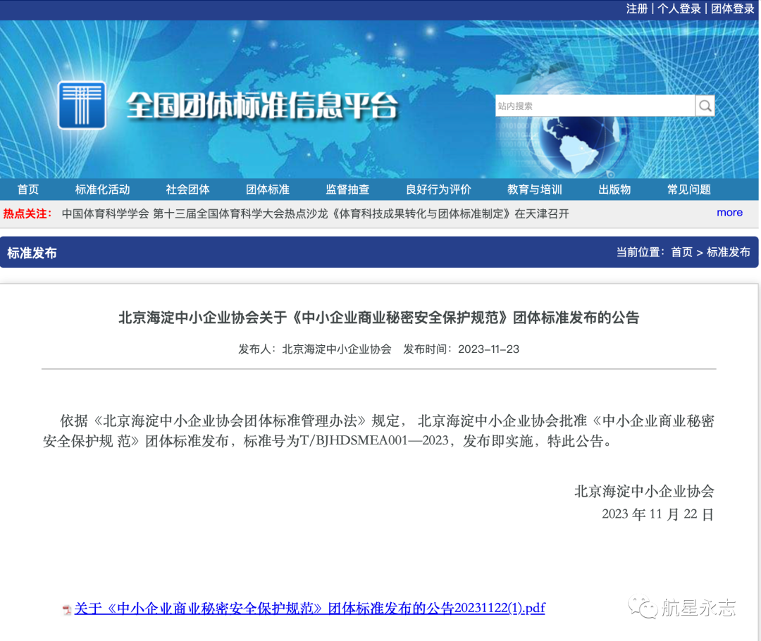 航星永志参与了由北京亿赛通科技发展有限责任公司负责牵头起草的《中小企业商业秘密安全保护规范》团体标准于2023年11月22日正式发布并实施。标准由北京海淀中小企业协会归口。