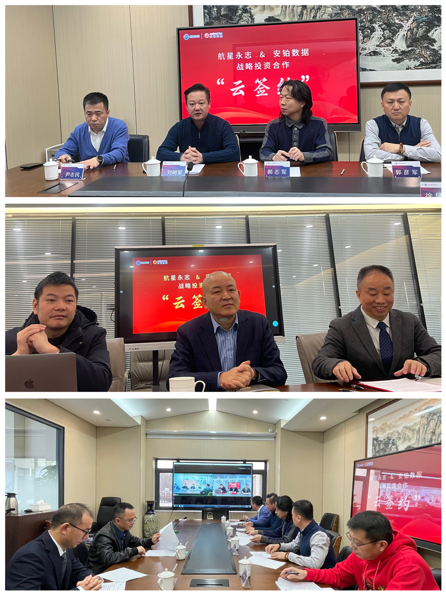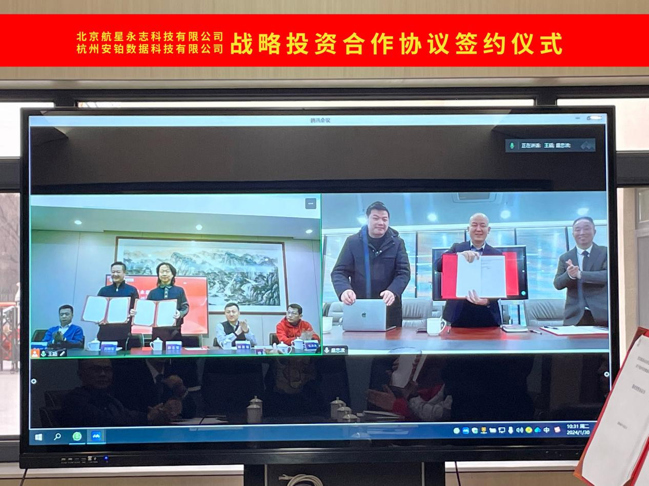 2024年1月30日,航星永志与杭州安铂数据科技有限公司(以下简称安铂数据)以“云签约”的方式成功签署战略投资合作协议。航星永志董事长郝志军、副董事长郭彦军、总裁张洪涛、战略发展部总监刘树军、董秘兼审计法务部总监尹志民,副总裁徐显和、保密总监高茂科和安铂数据董事长盛忠波、创始合伙人王青云、交付中心总监周旭等领导在北京和杭州两地共同出席线上签约仪式。