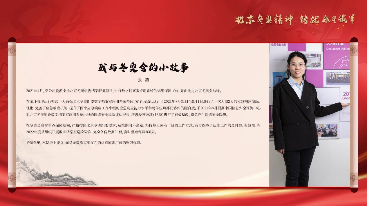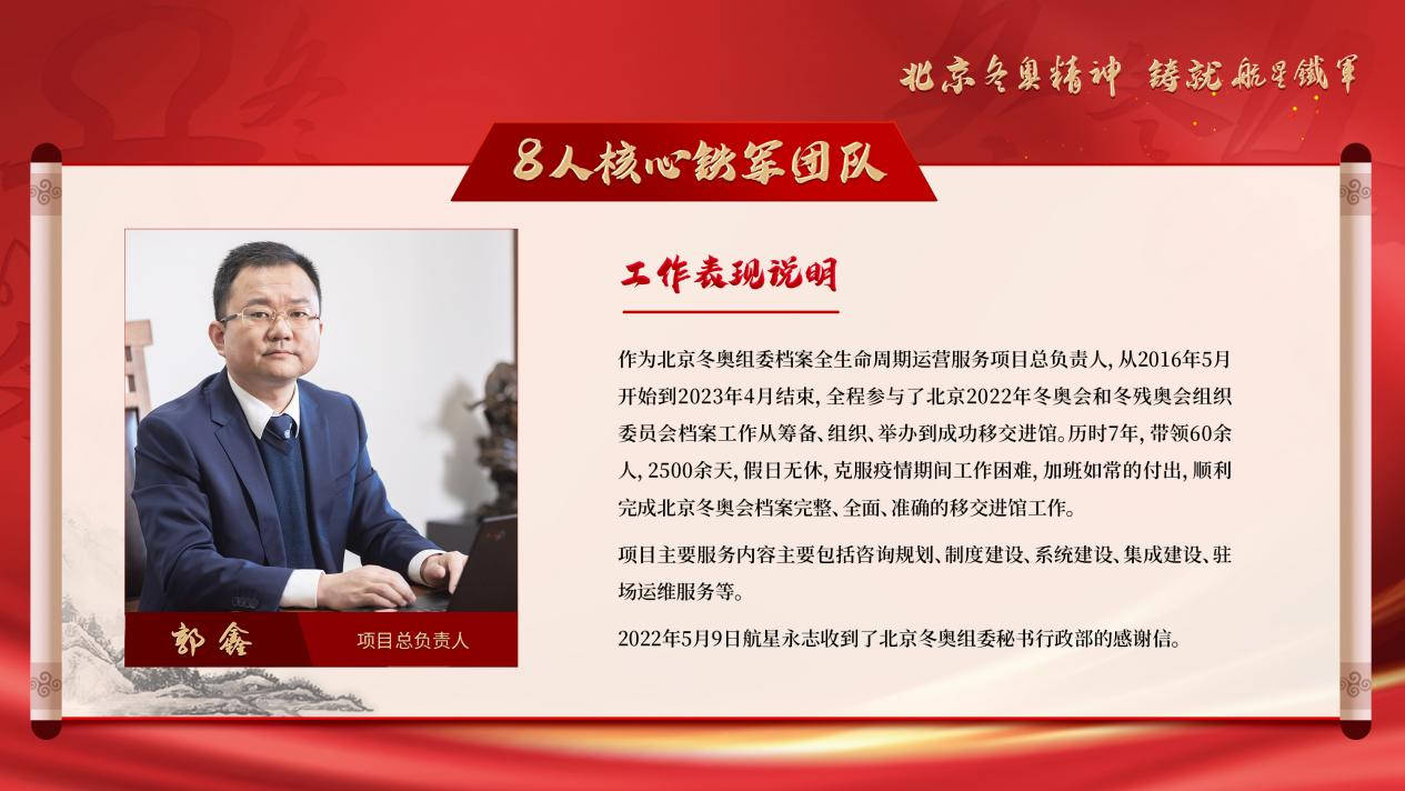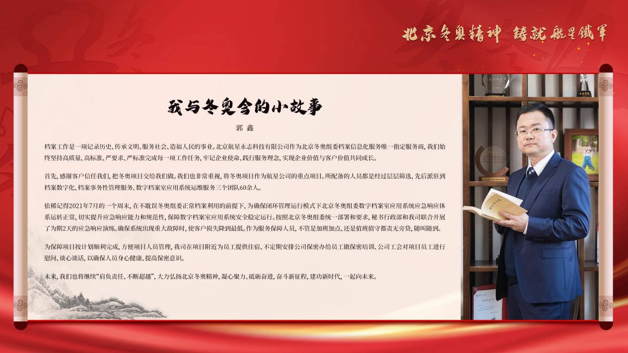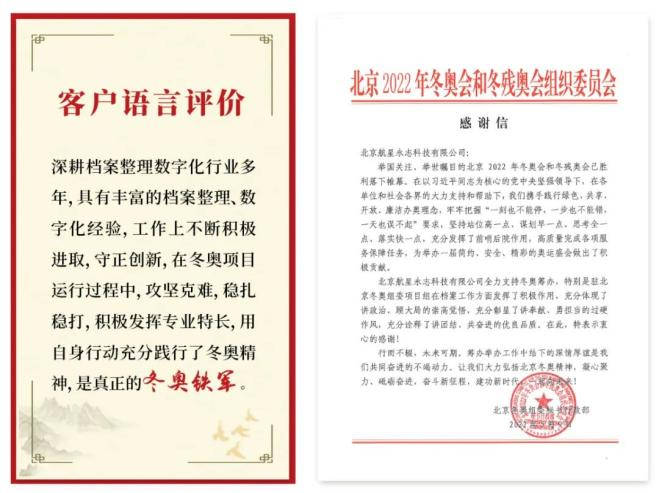 2016 年 5 月至 2023 年 4 月,航星永志作为北京冬奥会、冬残奥会档案服务合同商,历时7年、60余人冬奥铁军团队、2500余天全程无休,以勤奋敬业的精神、认真负责的态度和专业细致的水平,协助北京冬奥组委档案部门以优异的成绩圆满完成了冬奥档案工作任务。