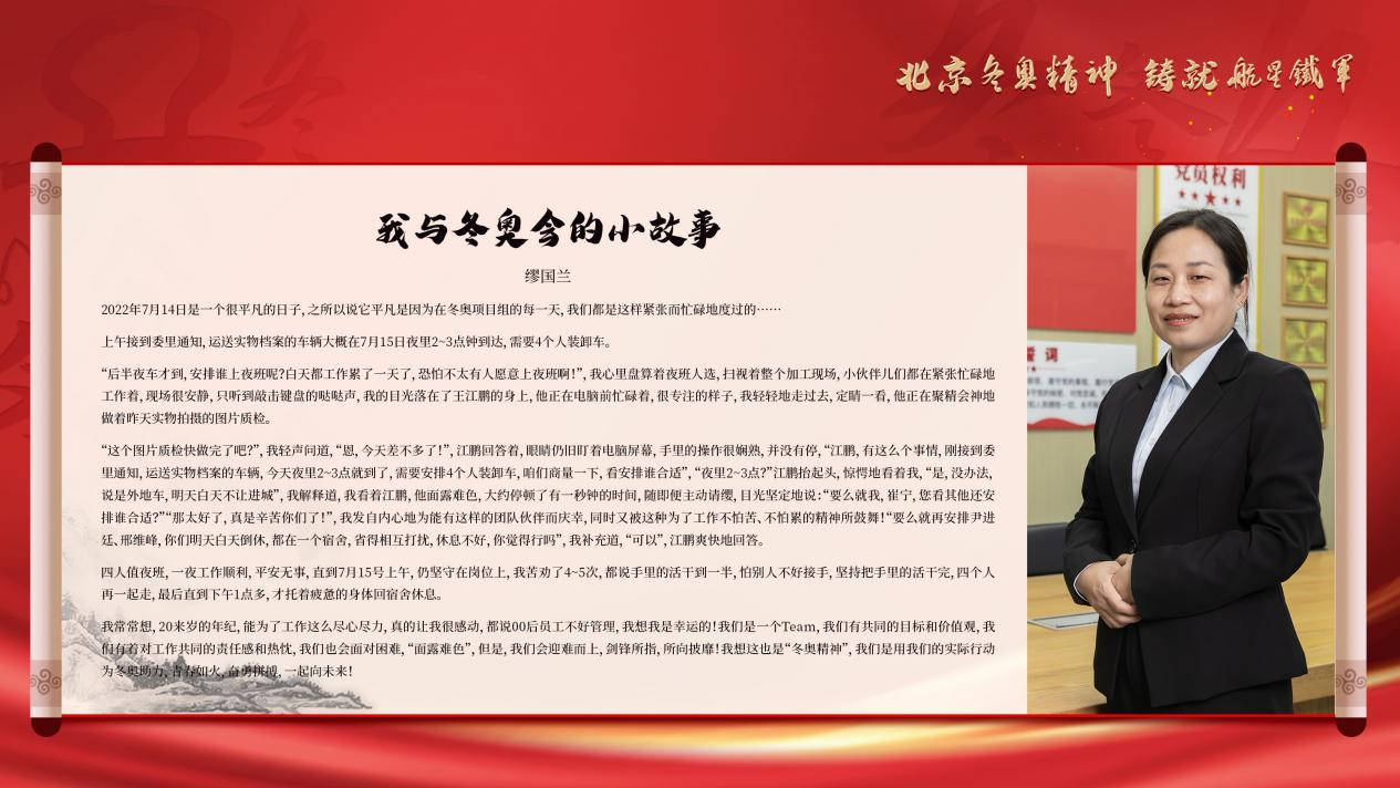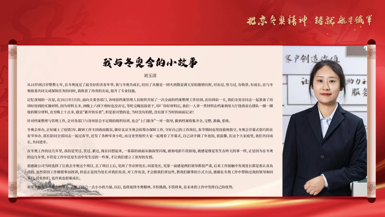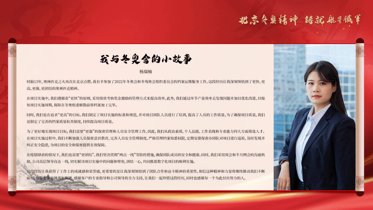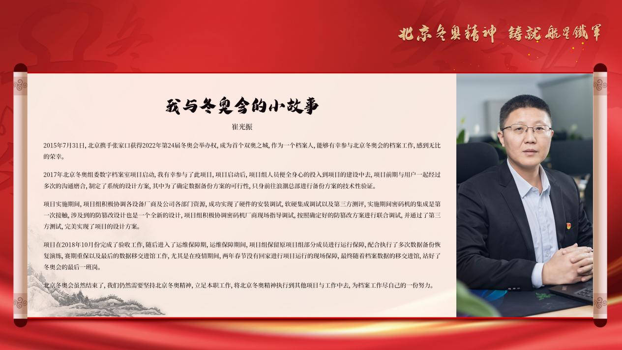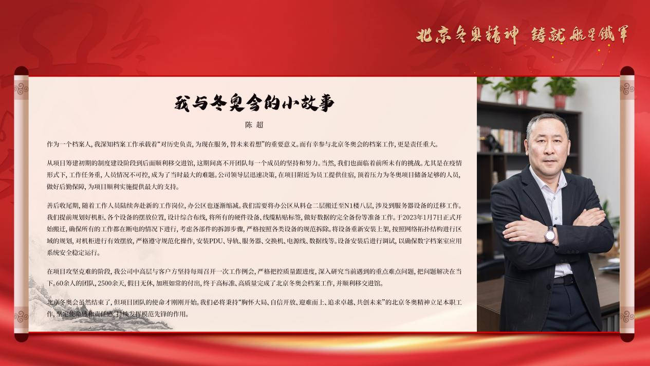 北京冬奥会、冬残奥会档案项目铁军团队势必会成为弘扬北京冬奥精神与企业精神的一面旗帜,永不落幕。北京冬奥会结束了,冬奥项目铁军团队新的使命才刚开始,围绕航星永志企业文化与战略规划,我们奋勇当先、全力以赴,立足本职工作,在团队中发挥模范先锋的作用。