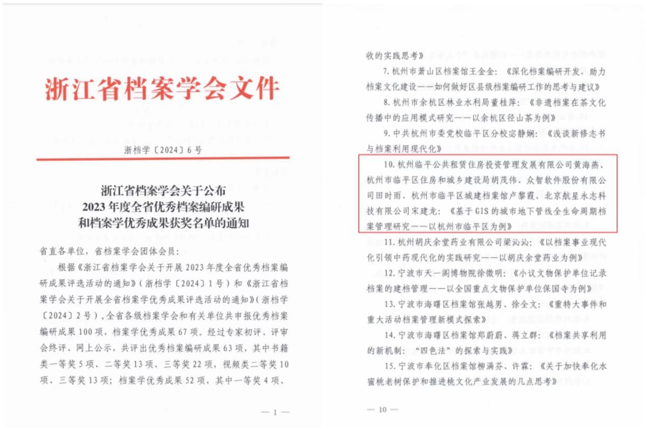 近日,浙江省档案学会发文公布了《2023年度全省优秀档案编研成果和档案学优秀成果获奖名单的通知》,其中,由临平区住建局建管中心(档案馆)、市政中心2家业务科室协同,临平公共租赁住房投资管理发展有限公司、北京航星永志科技有限公司和众智软件股份有限公司申报的《基于GIS的城市地下管线全生命周期档案管理研究—以杭州市临平区为例》荣获档案学优秀成果三等奖。