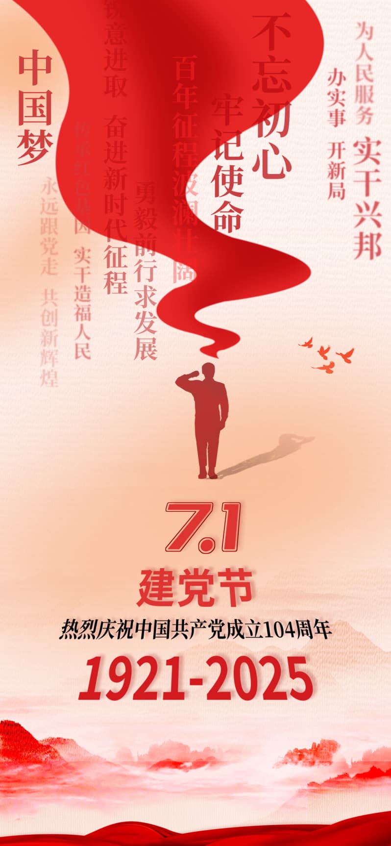 党徽闪耀,照亮前行道路,党旗飘扬,凝聚磅礴力量。值此建党节,让我们向伟大的党献上最诚挚的祝福,愿党永葆青春活力,继续带领中国人民奔赴更加灿烂辉煌的明天,续写新时代的盛世华章!