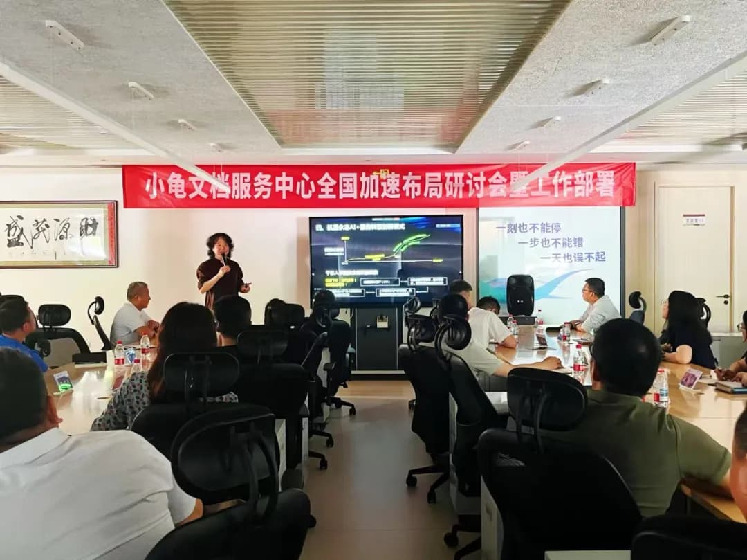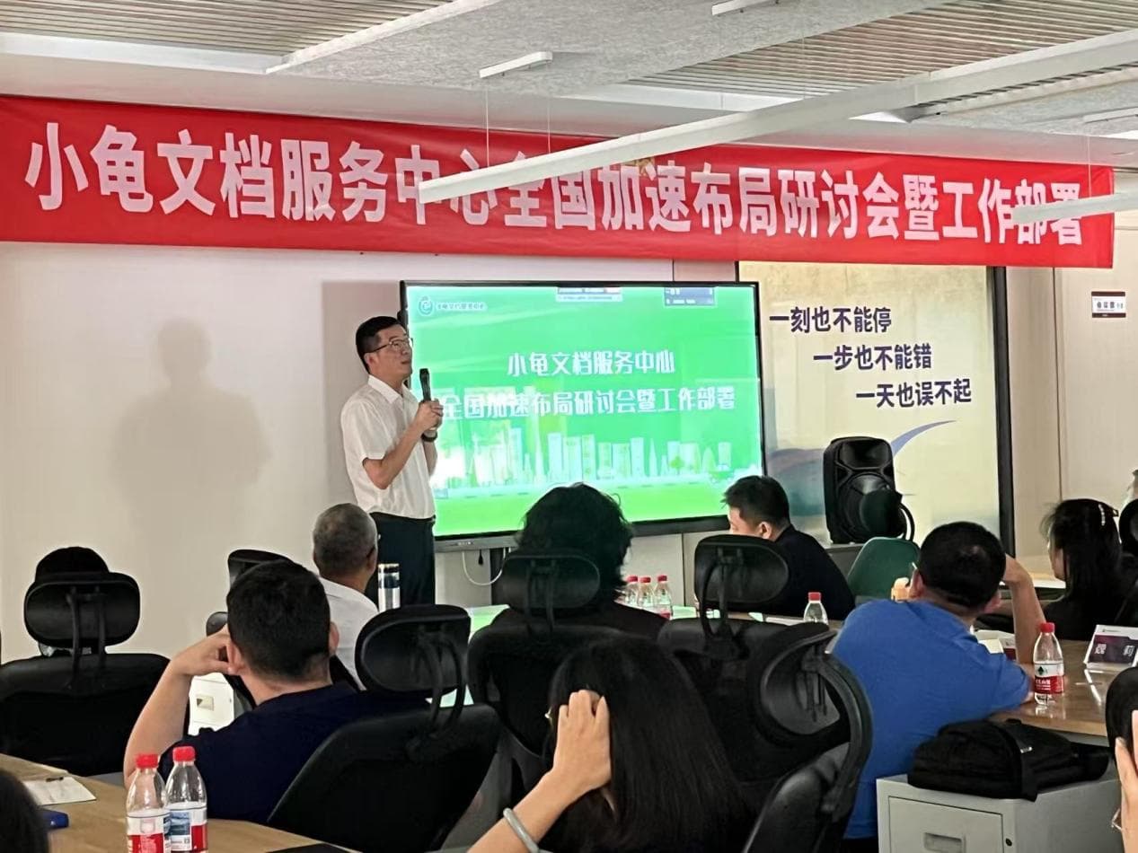2025年7月14日,小龟文档服务中心全国加速布局研讨会暨工作部署会议在北京总部隆重召开,航星永志董事长郝志军、总裁张洪涛、常务副总裁郭晓君、业务副总裁郭鑫、副总裁杨文辉等总部领导及全国十余家小龟文档门店业务负责人参与此次会议,聚焦全国服务网络拓展、总部与区域业务高效联动以及年度战略目标落地三大核心任务,为小龟文档服务中心高质量发展锚定方向、凝聚共识。