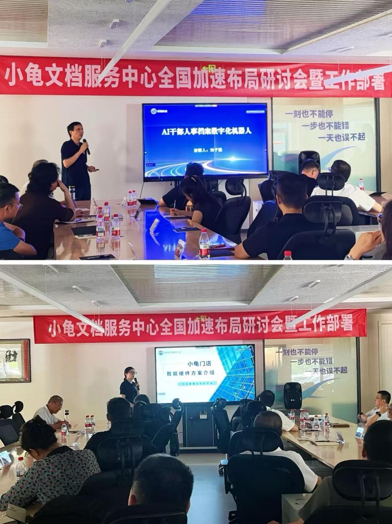 会上,航星永志人工智能技术研究院院长刘子强、智能设备与库房事业部常务副总经理李玲、AI干部教育研究院副院长蒋勇分别围绕AI干部人事档案数字化机器人、小龟门店智能硬件方案、干教业务与小龟协同发展规划等产品和服务标准进行了全面而细致的分享,为小龟文档服务中心的发展注入了新的科技动力与创新活力。