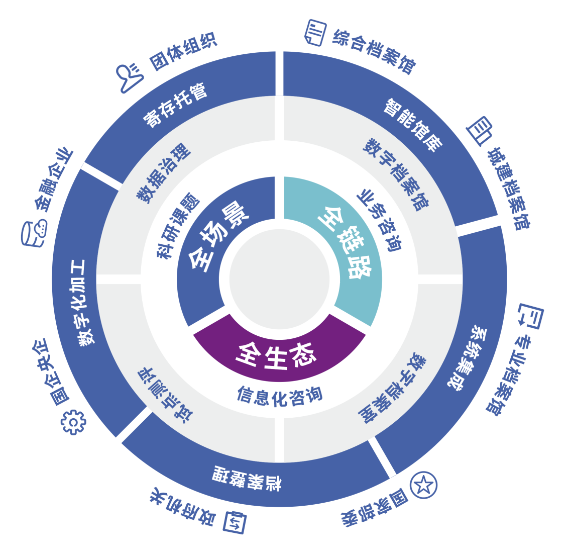 航星永志携手各领域合作伙伴整合科技创新资源,拥抱新质生产力,面向综合档案局馆、专业档案馆、党政机关、团体组织及企业集团等用户,打造覆盖咨询规划、数字档案馆(室)建设、智能库房搭建、系统集成、档案数据治理及实体寄存托管的全链路、全生态、全场景服务体系,通过全局赋能推动业档融合与档案资产升级,满足全方位管理需求。