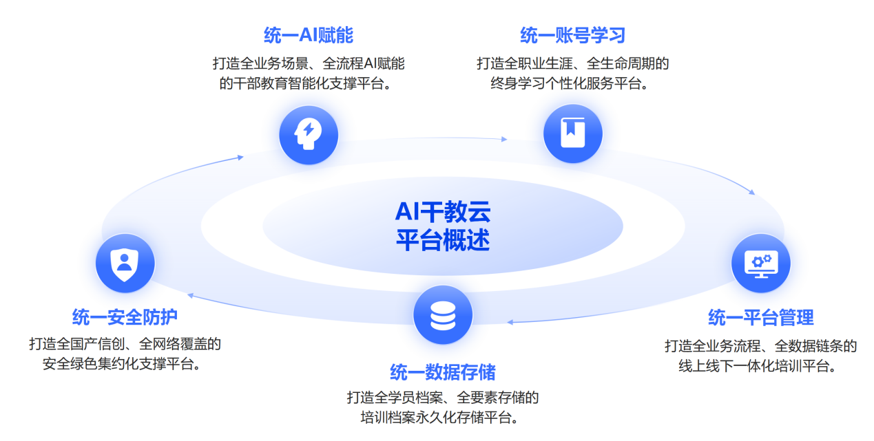 航星永志以“AI为先,服务为基础”战略为引领,融合云计算、大数据、人工智能等前沿技术,打造“AI干教云平台”。面向全国各级组织人事部门及干部教育培训机构提供AI云服务,构建干部、公务员、党员等组织人员全覆盖,培训资源全共享,线上线下全融合,培训流程全贯通,质效评估全维度的教育生态,全面深度融入AI技术驱动干部教育培训高质量发展。