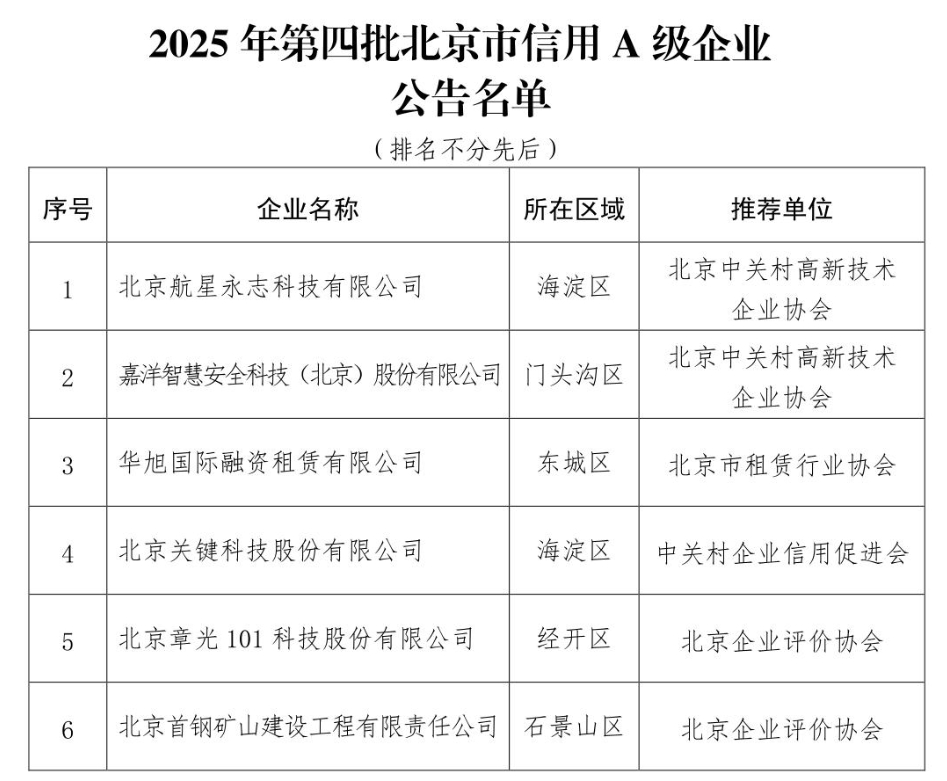 近日,北京企业评价协会公布了《2025年第四批北京市信用A级企业公告名单》,航星永志凭借在企业信用体系建设中的卓越表现,成功入选。