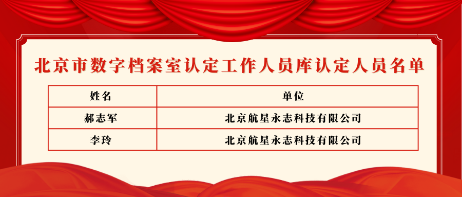 近日,北京市档案局正式公布北京市数字档案室认定工作人员库认定人员名单,航星永志董事长郝志军、高级咨询顾问李玲凭借深厚的行业积淀、扎实的专业能力及在人事信息与文档信息领域的卓越贡献,成功入选。